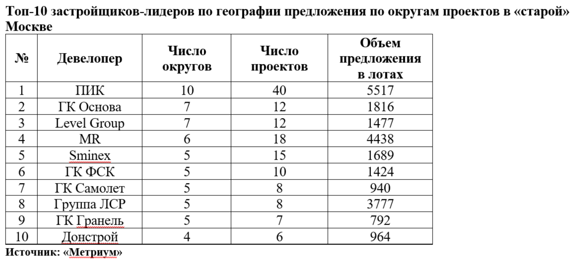 «Всего у 4 девелоперов география проектов превышает пять округов в «старой» Москве, – резюмирует Руслан Сырцов, управляющий директор компании «Метриум». – Девелоперские гиганты занимаются экспансией не только в другие регионы, но и максимально широко осваивают пространство мегаполиса. Такой подход гарантирует увеличение целевой аудитории, помогает диверсифицировать риски, дает страховку от затоваривания в определенной локации. Кроме того, подобная стратегия делает более узнаваемым бренд компании и позитивно влияет на кросс-маркетинг (формирование базы лояльных клиентов)».