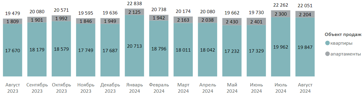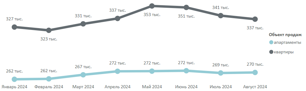 По подсчетам аналитиков «Метриум», средневзвешенная цена квадратного метра квартир и апартаментов по итогам августа 2024 года составила 330 810 руб. (-1,1% за месяц, -4% за квартал, +8% за год). Средневзвешенная цена квартир составила 336 570 руб. за кв. м (-1,3% за месяц, +8% за год), апартаментов – 270 120 руб. за кв. м (+0,2% за месяц, +3% за год).