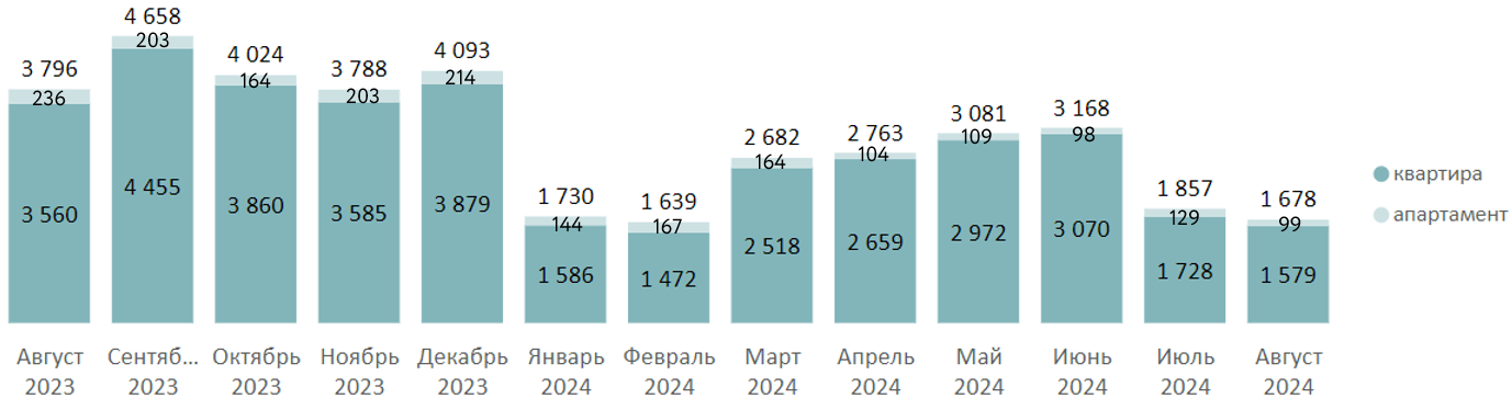 В августе 2024 года на первичном рынке жилой недвижимости массового сегмента было зарегистрировано 1,7 тыс. ДДУ (-9,6% за месяц, +2,4% за полгода, -55,8% за год).
