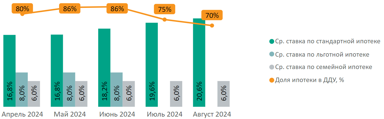 Доля сделок с ипотекой в августе упала до 70% (-5 п.п.).